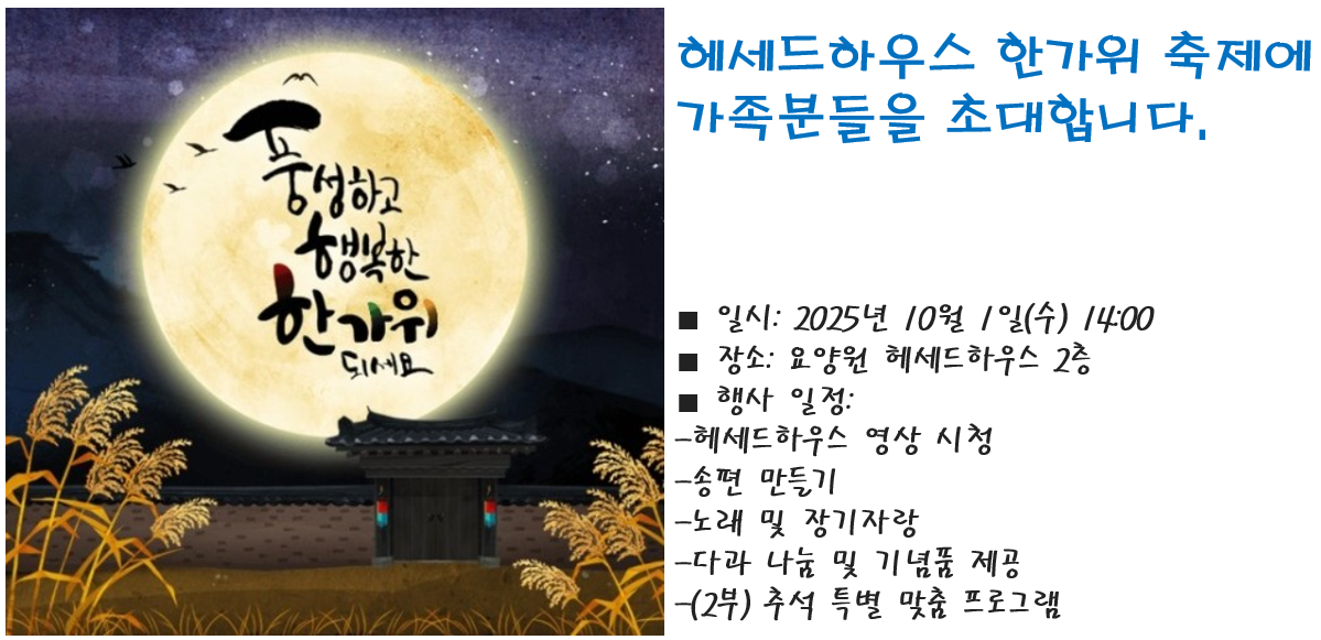 안녕하세요.민족 고유의 명절인 추석을 맞이하여,저희 요양원에서는 ‘헤세드 한가위 축제’를 계획하고 있습니다.보호자님들께서도 참석하셔서 함께 자리를 빛내주시면 감사하겠습니다.어르신들께 행복과 기쁨을 드릴 수 있도록 정성으로 준비하겠습니다.